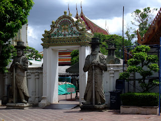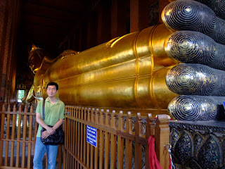 逛完市場,我們依據賣船票給我們的小姐所述,繼續往後走就可以到大皇宮,因為大皇宮的開門時間有限制,所以我們想說先到大皇宮去,再去臥佛寺。結果他路上的古玩攤超多,沒注意到要左轉到大皇宮的大門,結果一路走到臥佛寺去了,這段路真是超級酷熱,UNA都快變臉了。後來我們看到臥佛寺的大門,就進去參觀了。握佛真的很大一尊,如果沒去過,花個50B我覺得還蠻值得的,後來我們也順便參觀了裡面一些其他的佛寺、佛塔,都很有泰國特色,和我們的寺廟感覺很不相同。